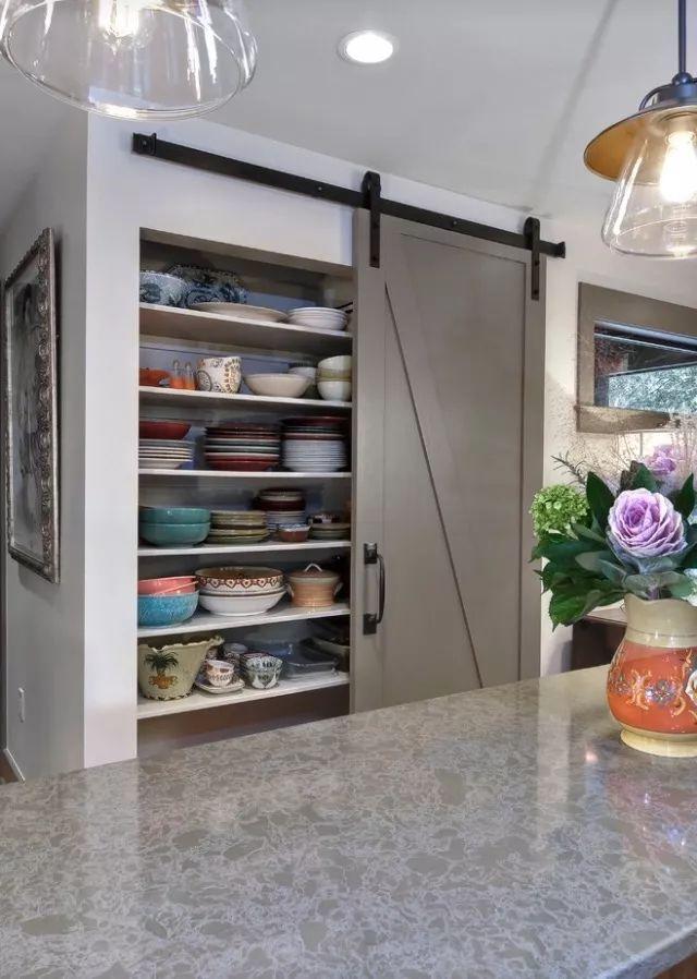 還有這種類似的谷倉(cāng)門,做嵌入式墻體的收納空間,也不需要太深,放置一些小型的廚房用具,杯子碗這些,可以收納很多東西,還不占地方,也美觀。