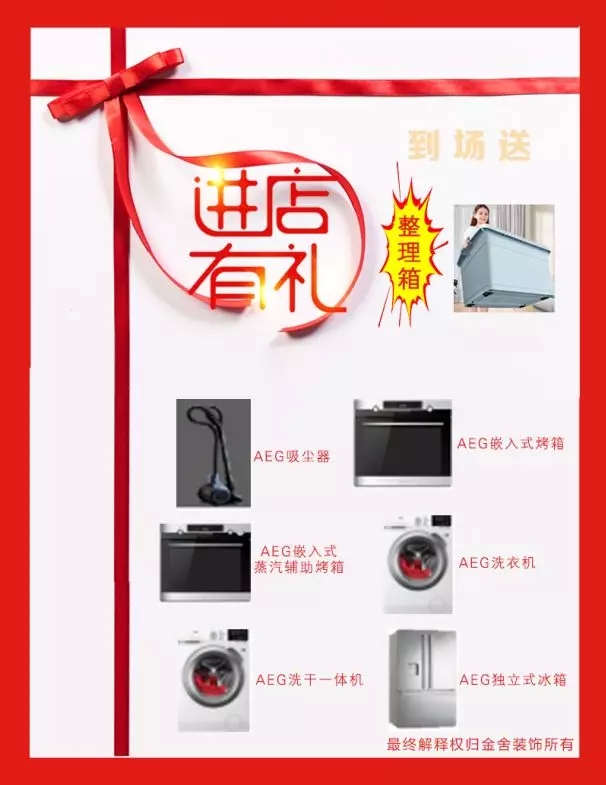 超多禮品當場放送,德國AEG的電器,整理箱,還有各種代金券,只要你選擇金舍就會讓你車的后備箱完全填滿,不會留下一個空白。凡活動期間(9月28日—9月30日)有裝修需求的客戶可進店詳詢,均會獲得巨大家居整理箱。