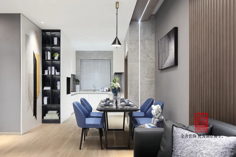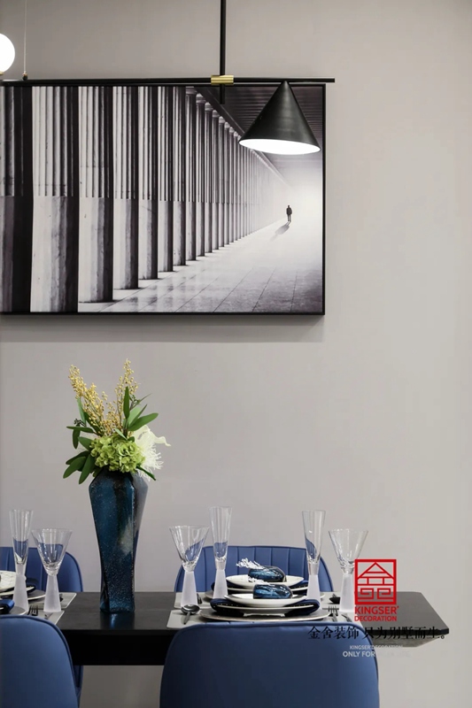 餐廳中運用灰藍色色調(diào),無需過多裝飾,簡約才是生活本味。整體的空間較小,能滿足基本的功能。在方寸間也能表現(xiàn)出一種舒適的感覺。