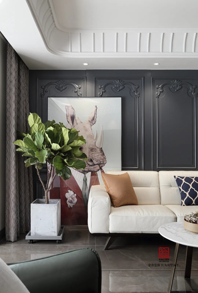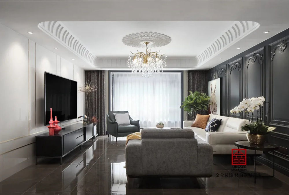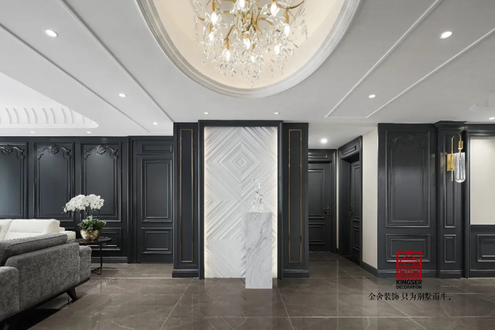 此案例為石家莊金舍裝飾-御河上院220平米新古典風格裝修實景。 新古典風格從簡單到繁雜、從整體到局部,精雕細琢、鑲花刻金都給人們留下一絲不茍的印象。它一方面保留了材質、色彩的精致風格,可以很強烈地感受到悠久的歷史痕跡與渾厚的文化底蘊,同時又摒棄了過于復雜的肌理和裝飾,簡化了線條。
