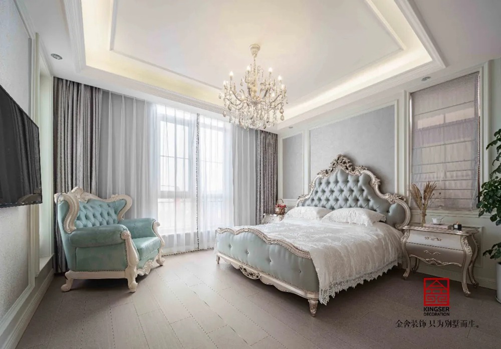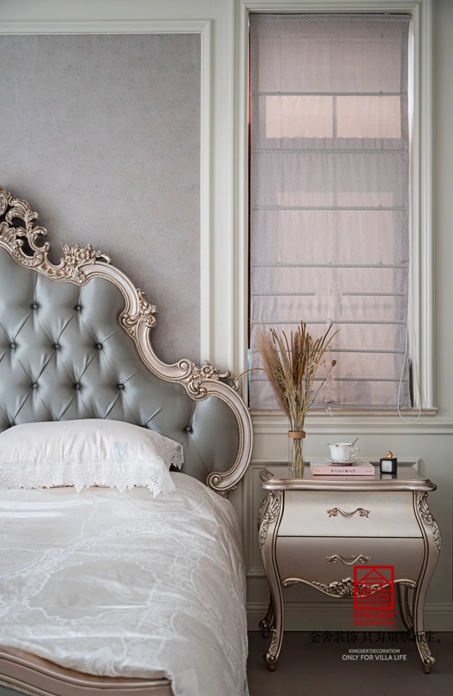 柔軟的床包和床品賦予了空間豐富飽滿的情感,經典的歐式裝修風格表現奢美華貴的格調,而背景墻上的清淡壁布則為空間帶了清幽的美感,增添清新之色。