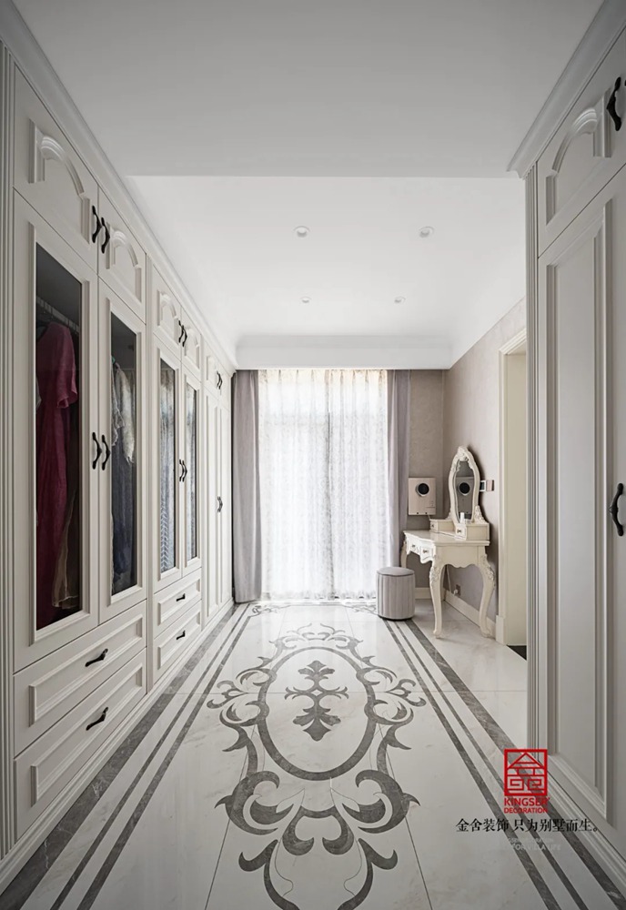 巨大的地面拼花就像在講述一個唯美的故事,婉轉而輕盈,又好似在訴說著那種獨到的歐式情懷,同時通頂的衣柜保證了整個空間的收納和衣物的擺放。