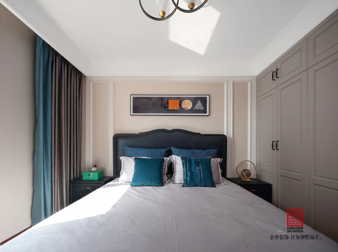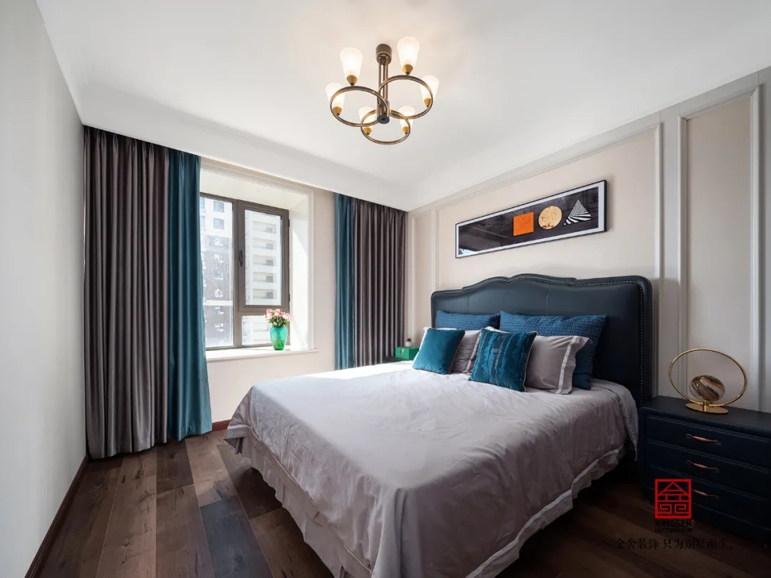 臥室空間中藍緞面家私配上深木色的地板,在居室中的那一抹顏色就像是存在的寶石一般讓整個空間不再單調,溫馨的家居不需要過多的裝飾,多多關注生活本身,目光所及,春光明媚,生命美好。