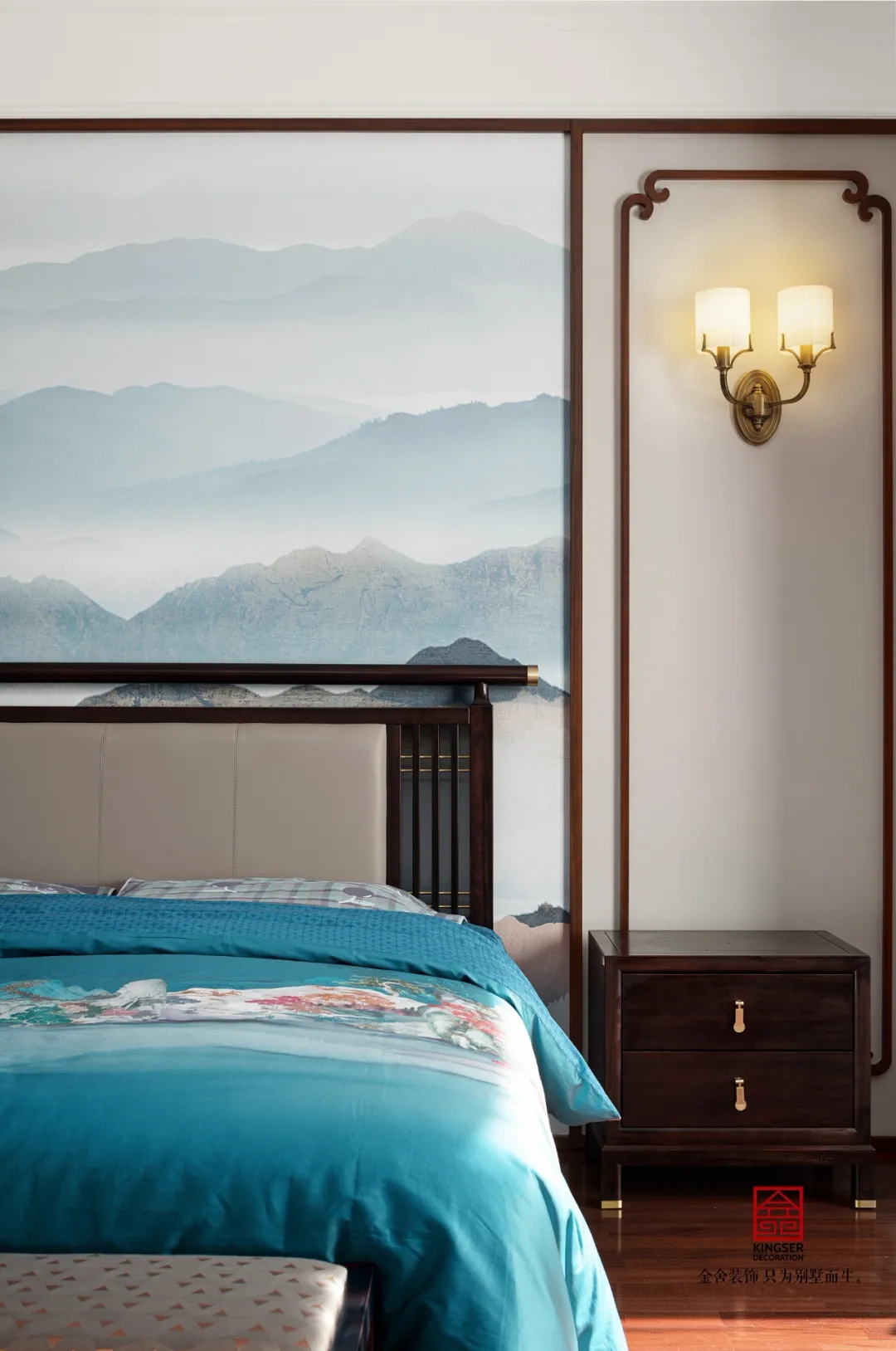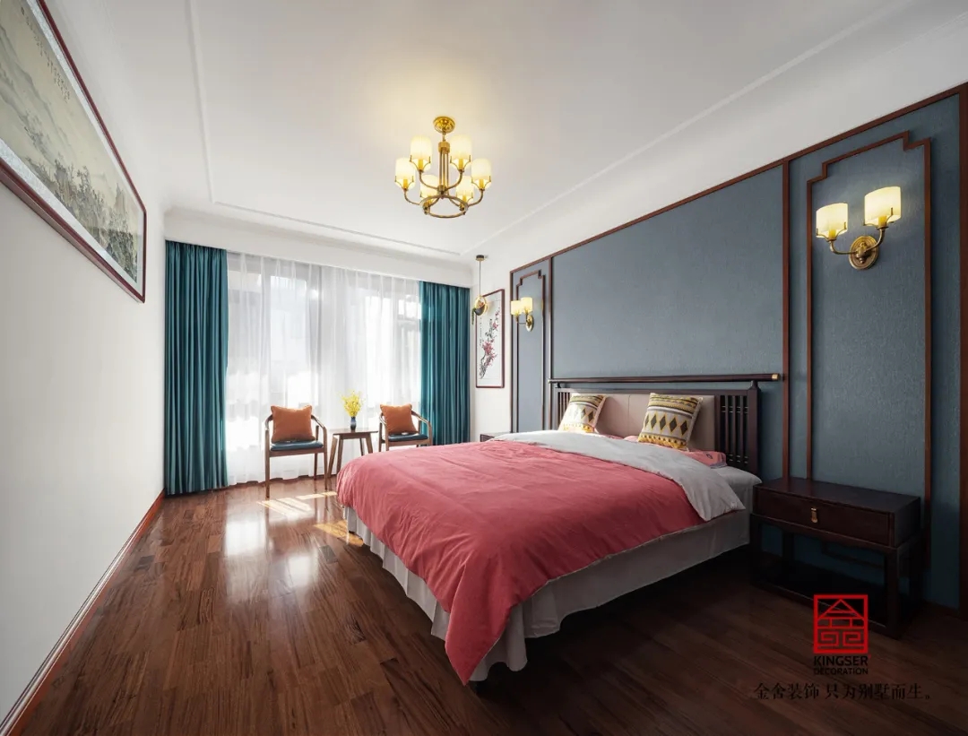 臥室空間看起來并沒有過多的浮夸裝飾,可設(shè)計師合理的配置與點綴,卻更好的完成了新中式別墅的古典與時尚交匯。