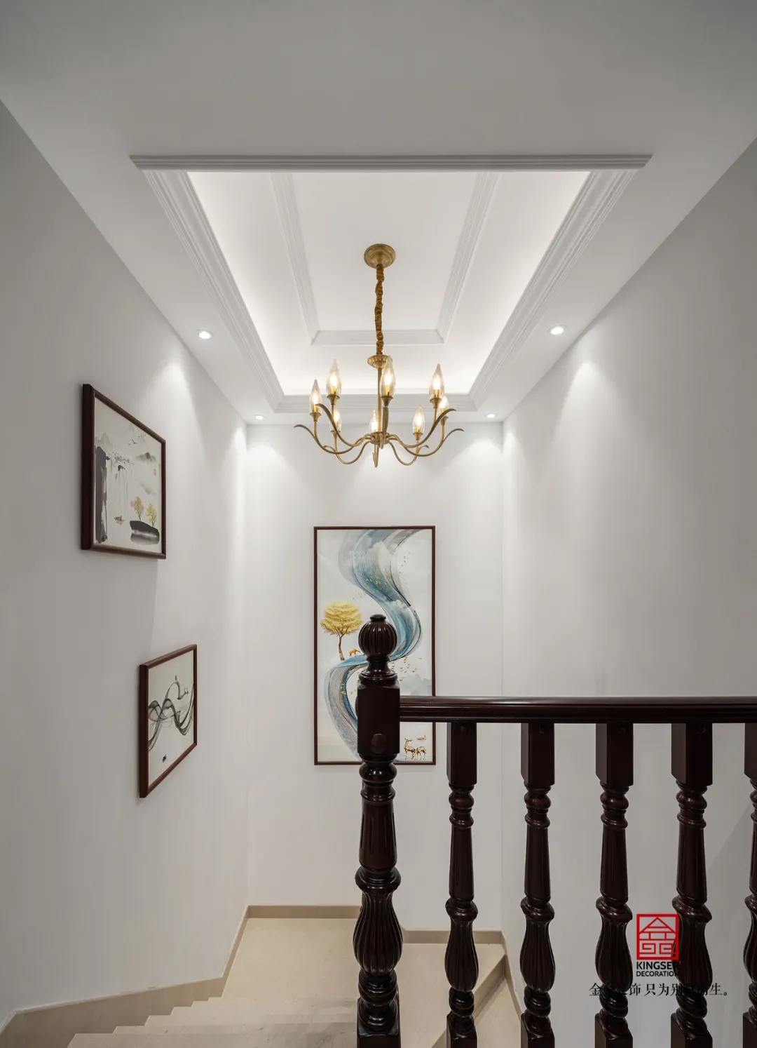 深木色的扶梯把手跟墻面的潔白無暇形成非常鮮明的對比,現(xiàn)代風(fēng)格繪畫加上古銅色的吊燈打破了樓梯間的單調(diào),突出了一種獨有的藝術(shù)氣息。