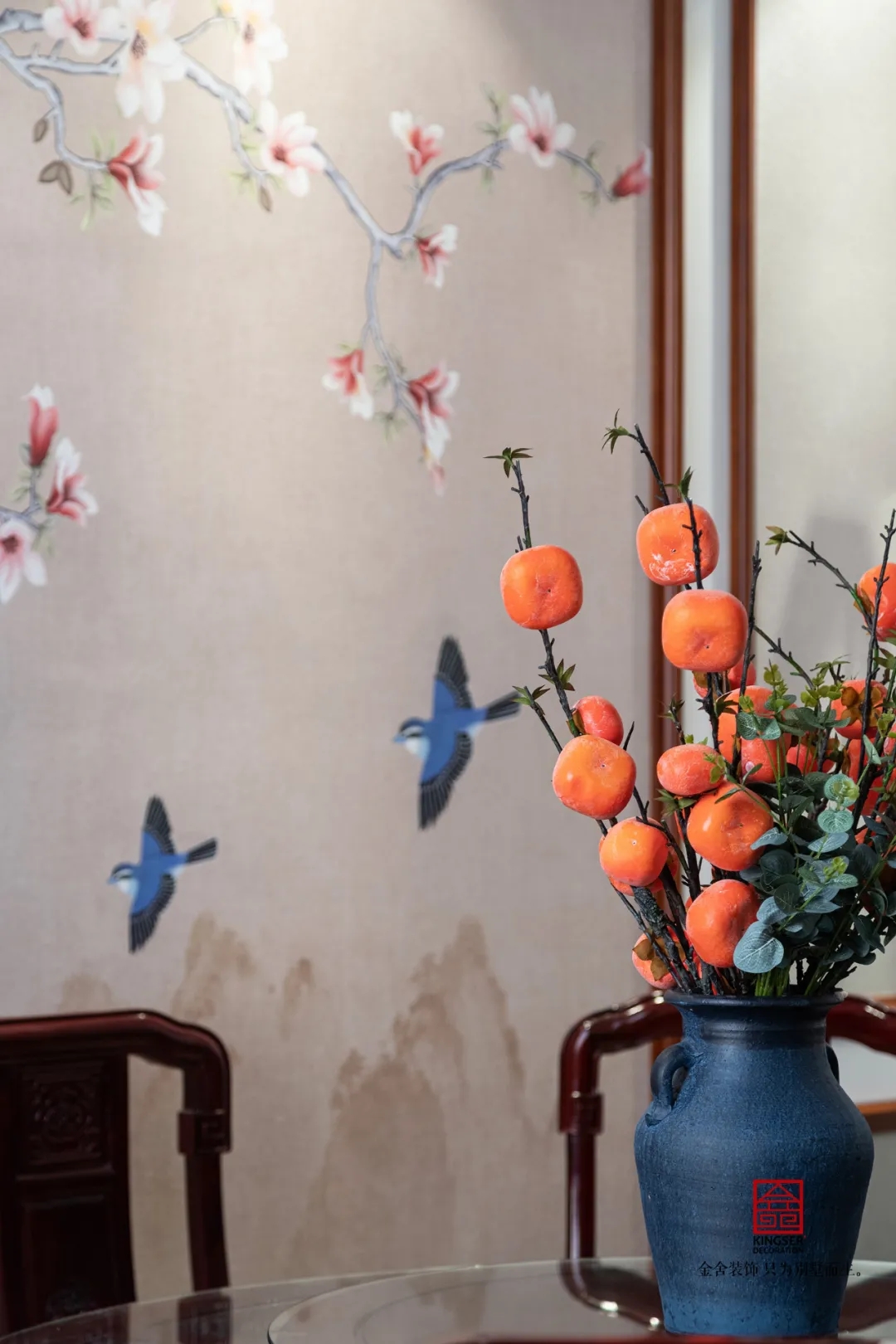 餐廳的圓形餐桌與方形吊頂相呼應(yīng),完美的嵌入了“方圓之間”的東方生活美學(xué)。既保留了原有頂面的高度又合理的劃分了空間,讓空間看起來更寬敞。餐廳背景墻的工筆花鳥更是提高了整個空間的靈動感,似在平淡的生活增加一份閑趣,讓家人在一飲一品之間感受生活的幸福。