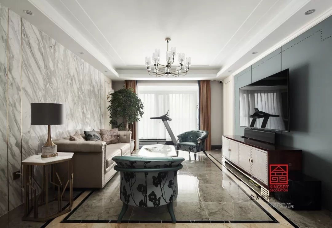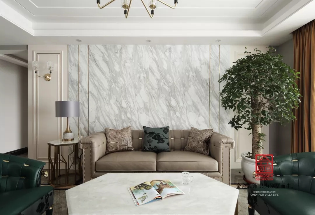 立于紛擾的世界,人們馬不停蹄的尋找獨屬自我的生活方式,空間成為了投射自我的一面鏡子??蛷d中的事物就是一個個滿足生活需要的元素,因為有他們存在我們才有現在的生活,一深一淺一素一濃的沙發在陽光下奕然生輝,融合多色調的綠色夾雜著自然紋路大理石,為整個空間創造出一種自然風十足的環境。