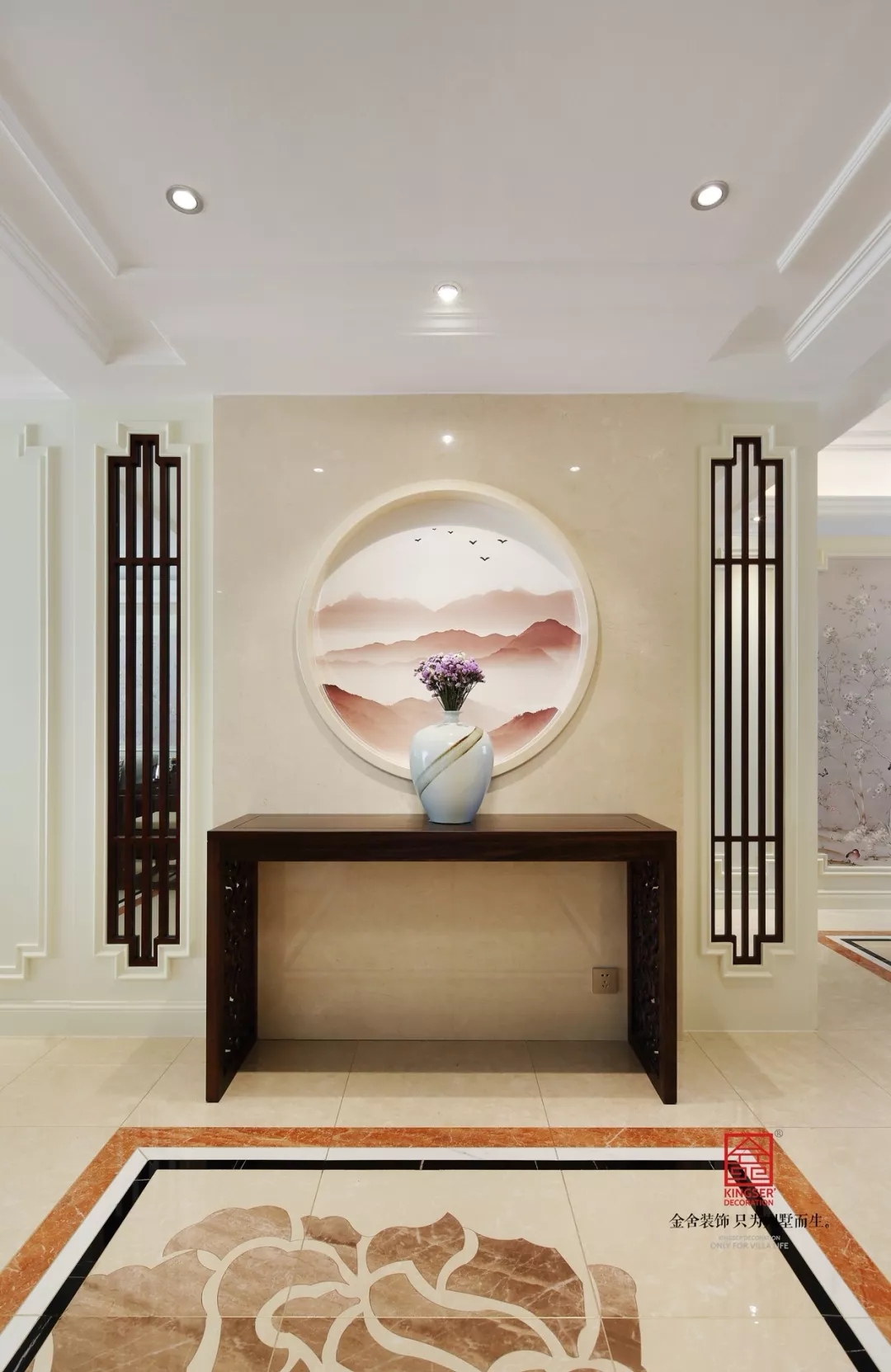 玄關(guān)走廊淡素色墻面,質(zhì)感簡(jiǎn)單又沉穩(wěn)、原始又兼具現(xiàn)代感,圓形的窗棱感覺(jué)與水墨風(fēng)的壁布融為一體,即凸顯出中式風(fēng)的特色,又形成色調(diào)上濃淡界限,增加空間層次。兩邊的木質(zhì)窗棱簡(jiǎn)潔樸質(zhì),頂面的射燈映背景墻,為樸厚空間注入柔美與雅韻。