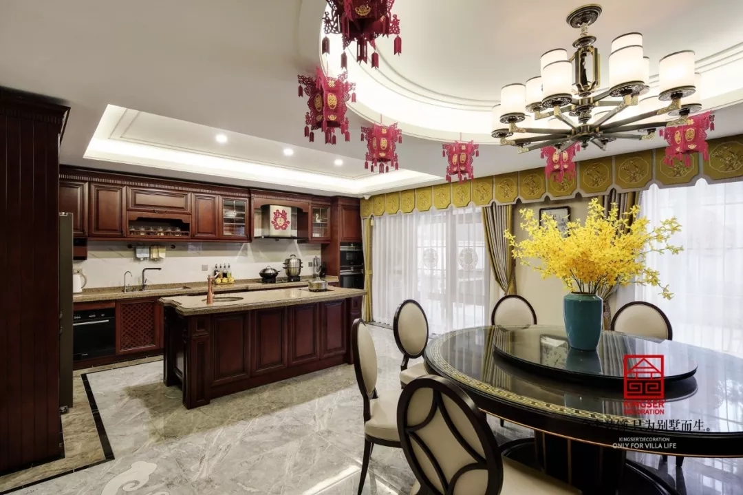 開(kāi)放式廚房緊挨著以圓桌為主體的餐廳,中國(guó)人的傳統(tǒng)就是追求和和美美,用圓形的餐桌象征著團(tuán)圓與和美。廚房的整體風(fēng)格還是注重中式風(fēng)格的廚房,只用中間出現(xiàn)的島臺(tái)才體現(xiàn)細(xì)節(jié)的差異。