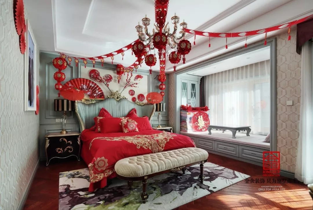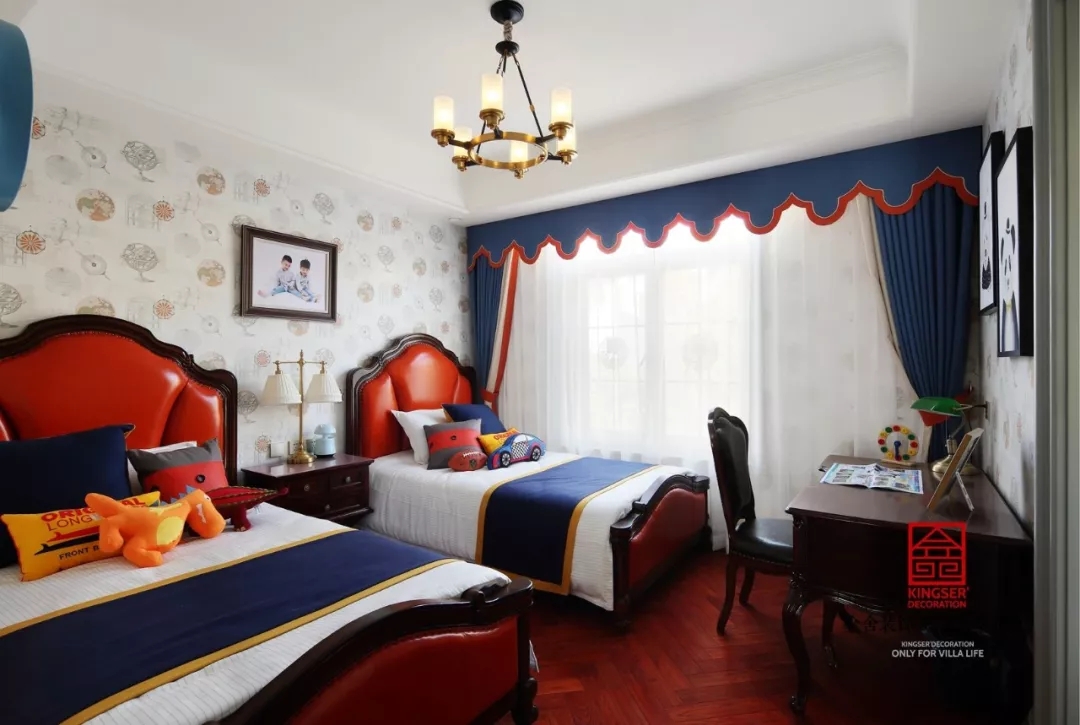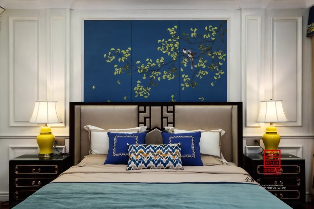 臥室“靜”與“凈”都藏在每一個(gè)元素里。內(nèi)蘊(yùn)悠遠(yuǎn),優(yōu)雅從容,相伴入眠,讓夢(mèng)境都變得詩(shī)意起來(lái)。臥室在配色上沒(méi)有考慮中式的傳統(tǒng)配色,而是用的紅色與藍(lán)色的配合,讓對(duì)比色擺脫傳統(tǒng)的中式氛圍,讓中式的感覺(jué)發(fā)生一個(gè)質(zhì)的飛躍,讓時(shí)尚感充滿整個(gè)空間。