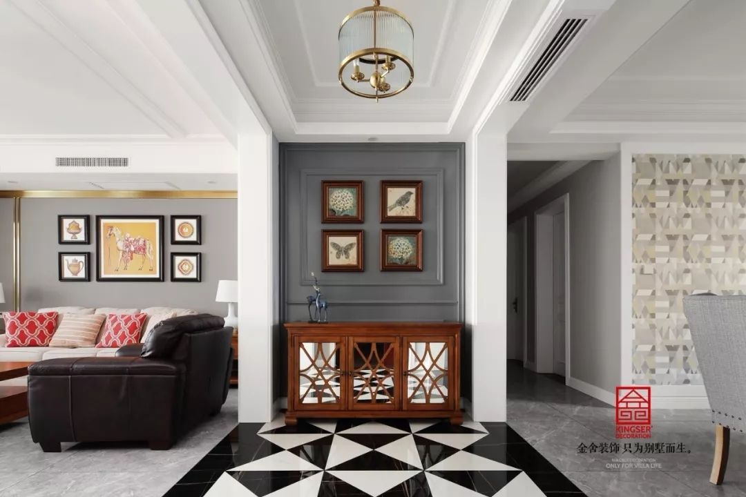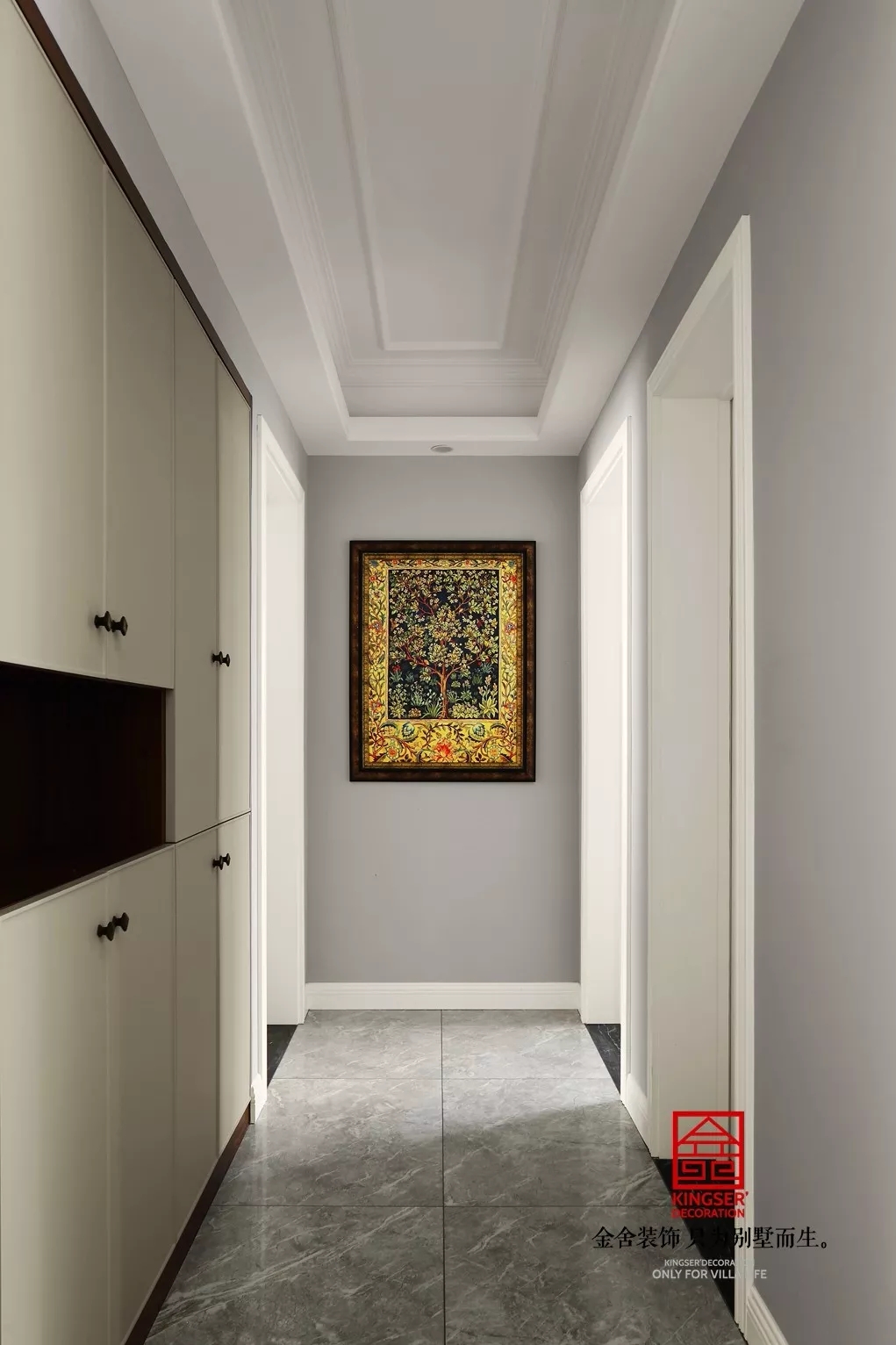 此案例為石家莊金舍裝飾-瀚唐三期159平米簡美風格裝修實景圖。這個項目整體設計使用其最為擅長的簡美融合高級灰的效果,打造優雅沉穩的奢尚家居體驗,局部使用了金色的金屬質感邊條,營造神秘、冷精、恬美的設計氛圍。
