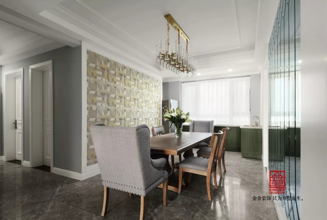 精致的裝飾細節表現了設計師的細膩,從大空間到小細節,都在做整體呼應,金屬與木質的配合,表現了對品質生活的向往,大面積的灰體現出來的高級感,簡單流暢的線條,讓整個空間既舒適又時尚。餐廳內造型充滿現代感的金屬吊燈,讓整個空間更加柔美,形成一個溫馨的用餐環境。餐廳背景墻的銀色鏡子更是增加了就餐時的趣味。