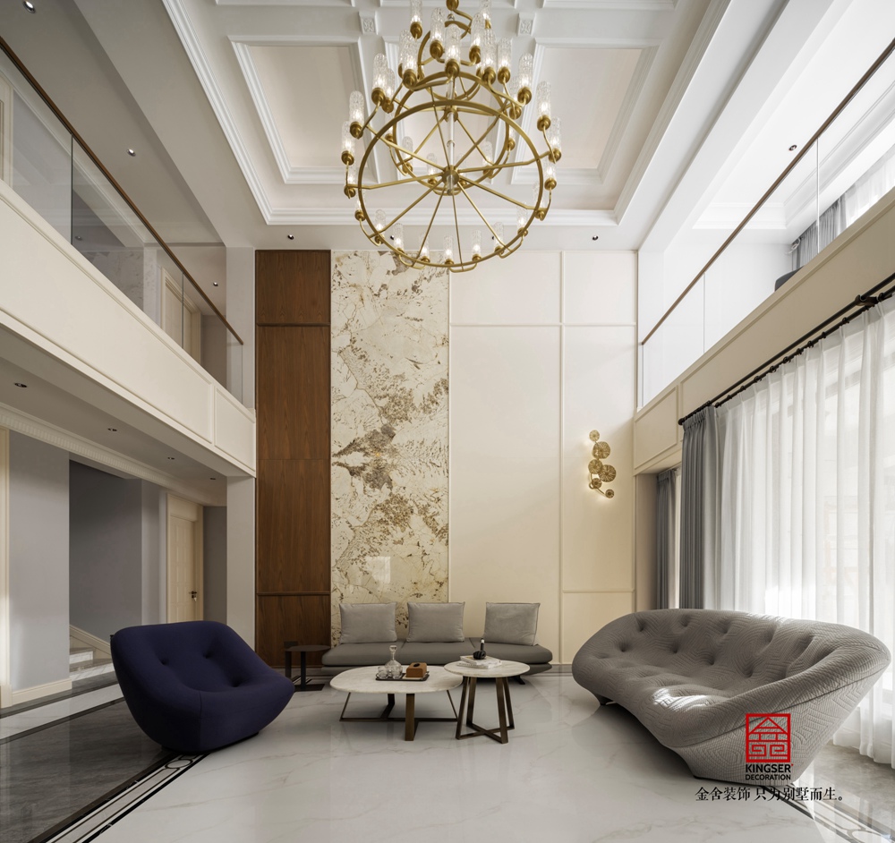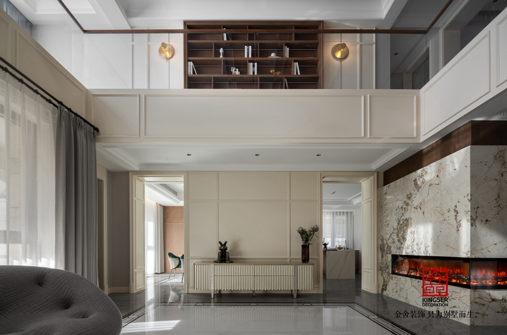 別墅的客廳,無疑是整棟建筑中的璀璨明珠。在挑高六米的宏偉空間中,我們巧妙地布置了一個簡約風格的轉角壁爐區,與素色沙發相映成趣,營造出一種既現代又舒適的氛圍。