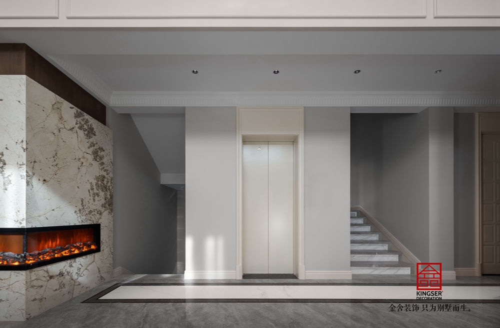 轉角壁爐的設計簡約而不失優雅,其獨特的造型與客廳的挑高設計相得益彰。壁爐的火焰在寒冷的季節里跳躍著,為整個空間帶來溫暖與生機。而素色沙發則以其純凈的色彩和舒適的觸感,為客廳增添了一份寧靜與和諧。