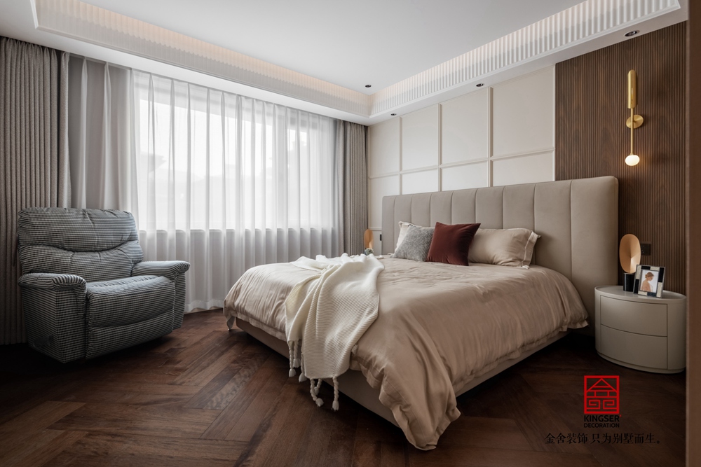 三層的空間就屬于完全的靜區了,除了一個三合一套間式的主臥之外還有一個書房。主臥完全采用深棕色木地板,吻戲而舒適,玻璃磚的設計保證了走廊的采光,將近四十平的臥室也給人一種氣派而美觀的感覺。