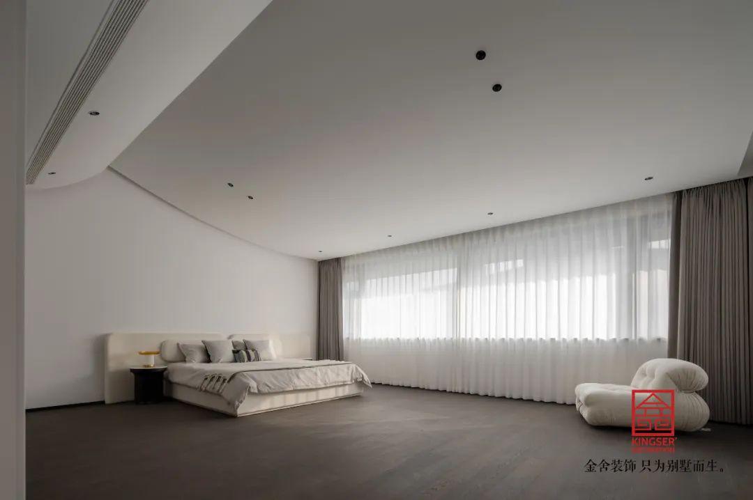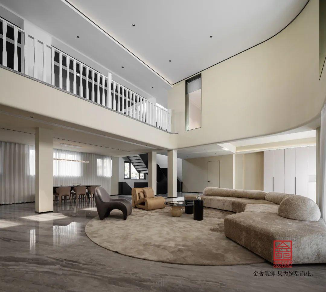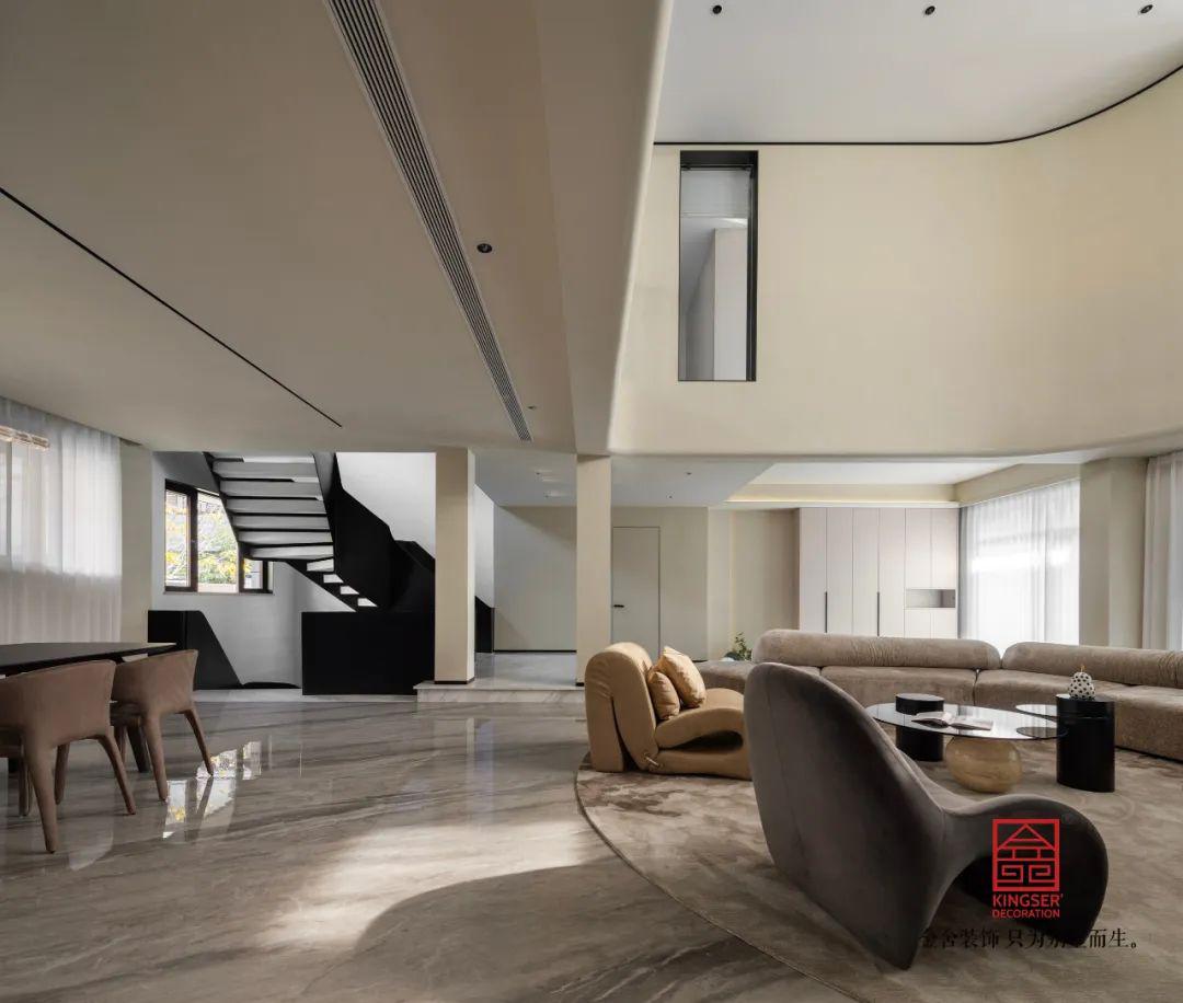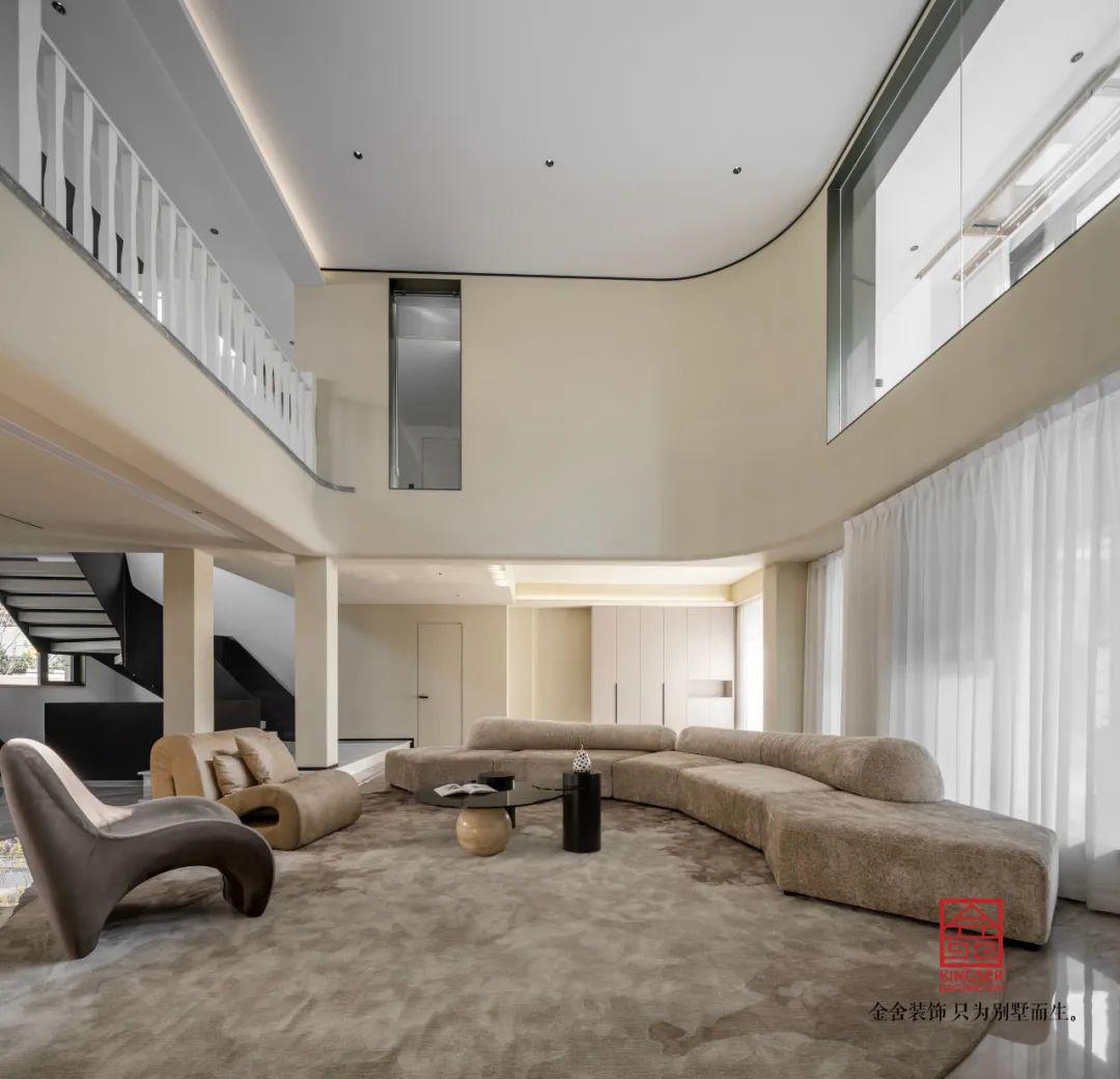 巨大的挑空空間之下,是設計師對于設計的把控,首層6米挑空客廳以鋼化玻璃幕墻打造通透感,雙層中空玻璃引入充沛自然光,半開放的廚房、島臺吧臺與落地窗景融為一體。全屋采用暖白、卡其、米咖等低飽和色調,墻面啞光質感涂料與淺咖沙發碰撞,塑造出極具質感的空間。