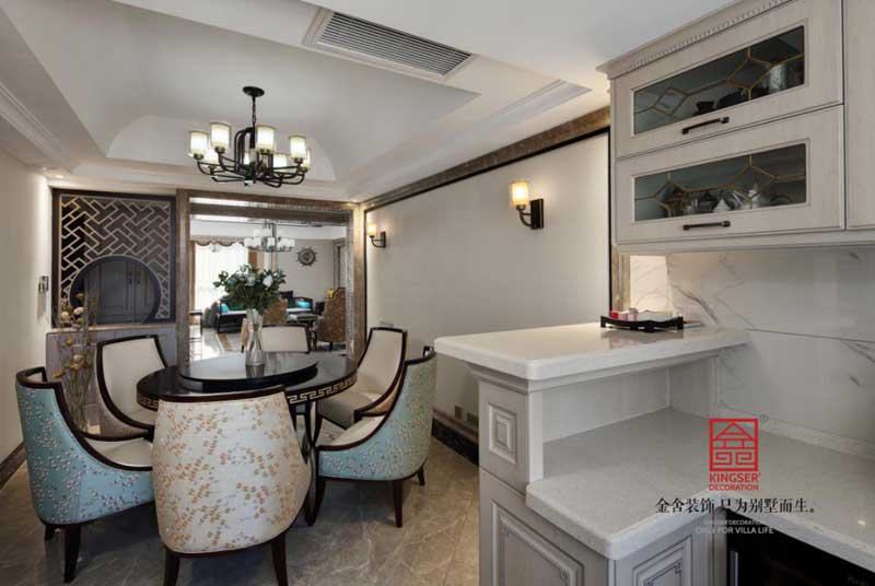 設計說明:此案例為石家莊金舍裝飾-珺合府180平米新中式風格裝修實景中式風格源遠流長,木質紋理家具加上寫意白描繪畫融合一體,家居生活的方方面面都與中式風格的家裝緊密聯系而又互相獨立,讓生活的味道融入到家居之中。