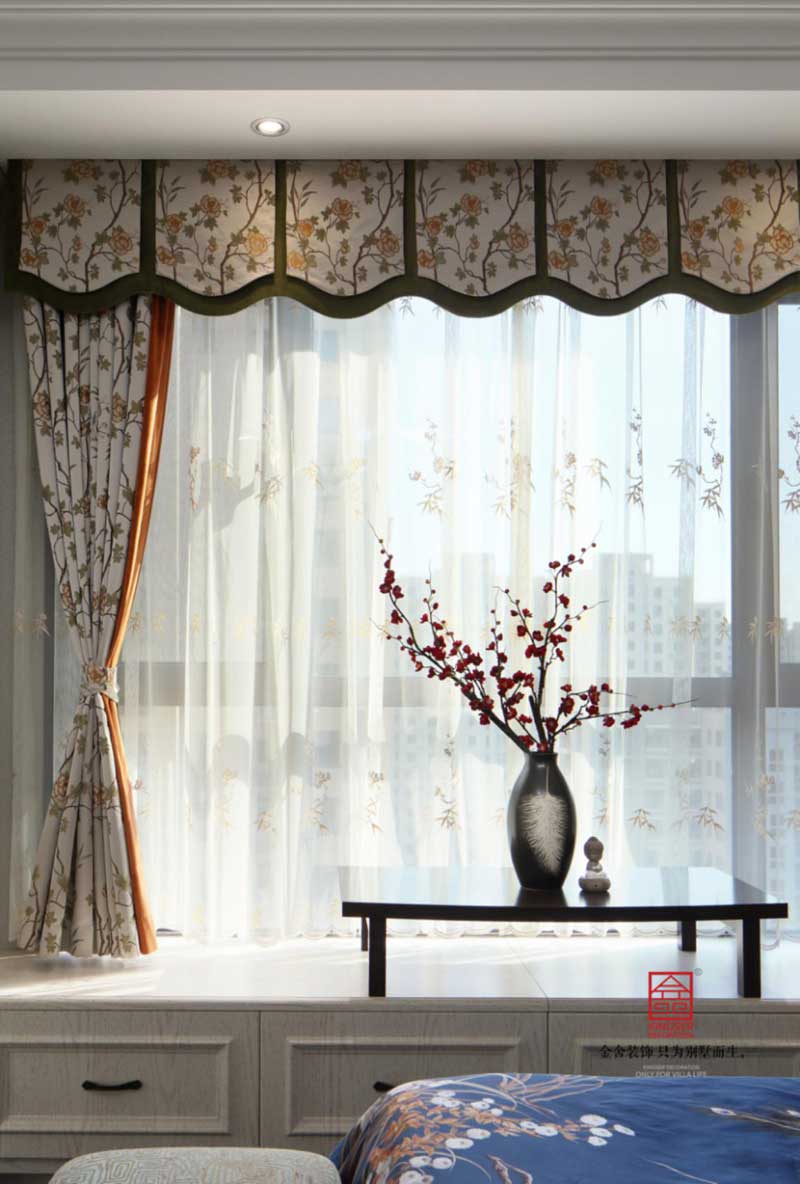 緞錦的寶石藍和絲綢的淺湖藍與背景墻象征這海天相接,相輔相成,每一個顏色都形成一種深遠的意境,或蕭瑟,或廣闊,或沉穩,或舒揚,不同的情景不同的韻味成就不同的家居舒適空間。
