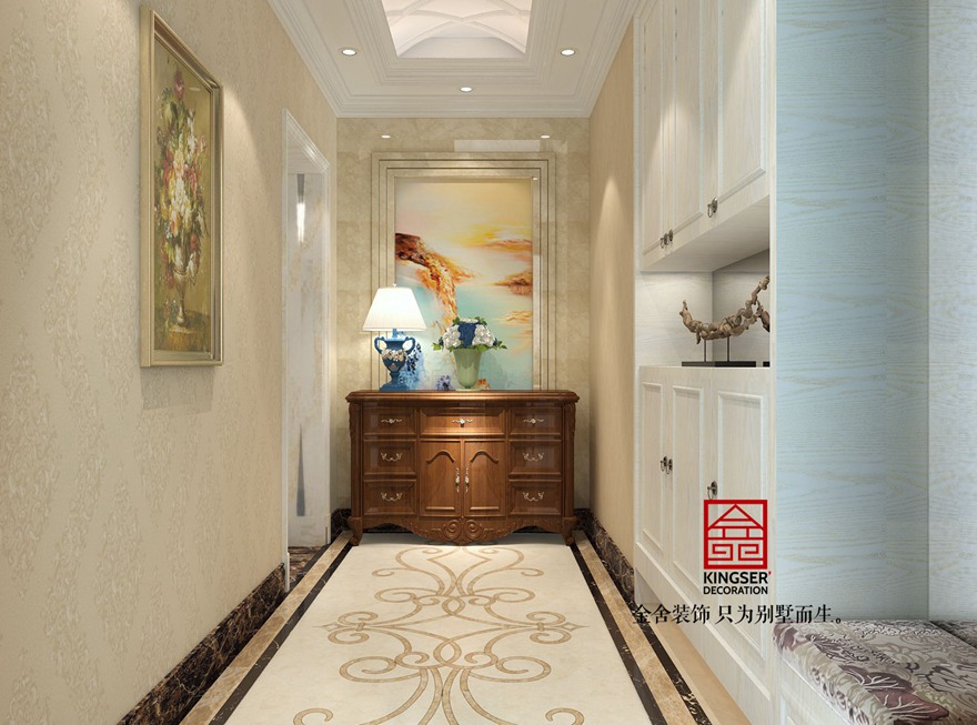 設(shè)計說明:此案例為石家莊金舍裝飾-原河名墅400平米歐式風(fēng)格裝修效果圖。沒有純歐式的繁亂,客廳與臥室的對比繁簡統(tǒng)一,讓人心情平靜。椅子藍色皮質(zhì)與臥室藍色布藝相輝映,使之更為整體。束花裝飾點綴及綠植擺設(shè)使整個空間更加清新田園。田園氣息讓人在忙碌的都市多了份愜意和滿足。金屬材質(zhì)以及水晶吊燈讓整個空間更為時尚、大氣。真正做到了大氣而又內(nèi)容。