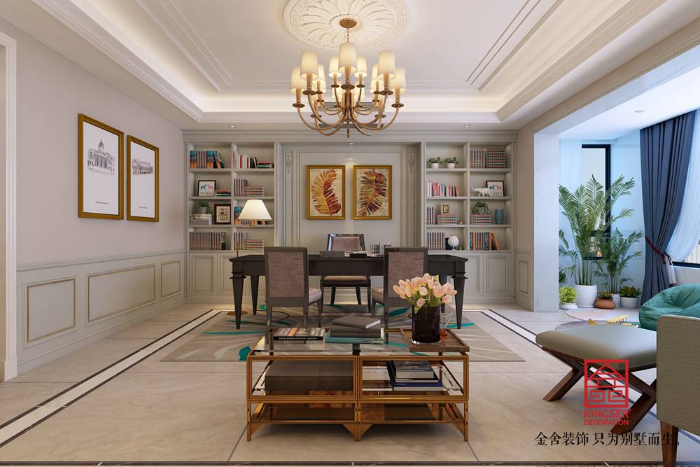 設計說明:此案例為石家莊金舍裝飾-榮盛華府200平米混搭風格裝修效果圖。傳統的客廳以電視墻為主導,沙發和茶幾的高度往往相差不大,這樣的高度差對于孩子寫作業或是成年人看書寫字和使用電腦是沒有舒適度可言的,因此一些有工作和學習需求的家庭可以考慮把家庭工作室融入客廳,利用靠墻的大操作臺和各種墻面擱板架,滿足多人工作的需求