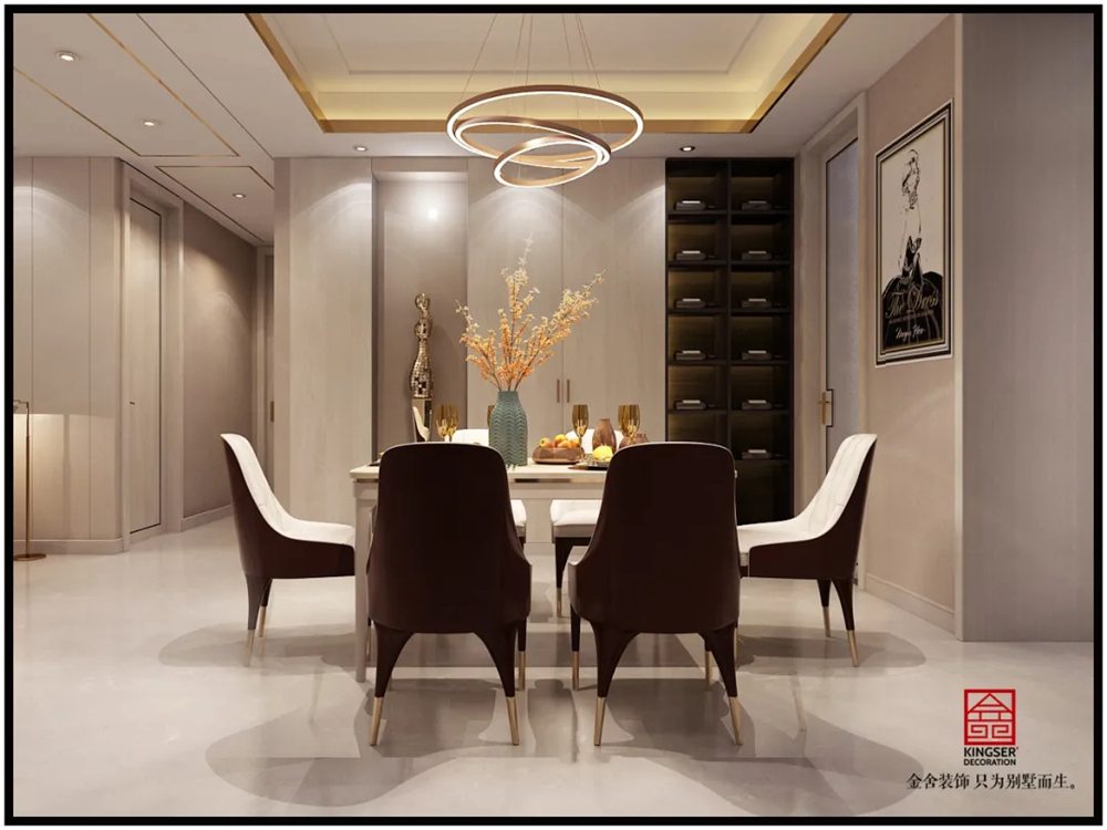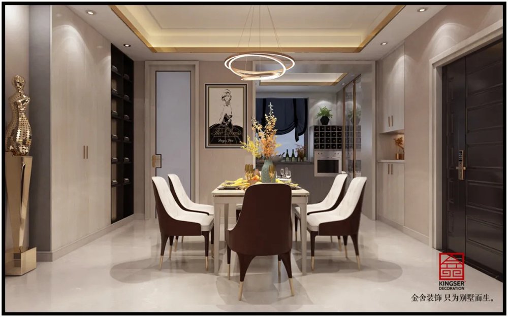 深咖色的餐桌凳與墻面的木紋柜子顏色和諧融合,造型流線感十足的吊燈下將不同的燈光效果映襯到每一個墻面之上。