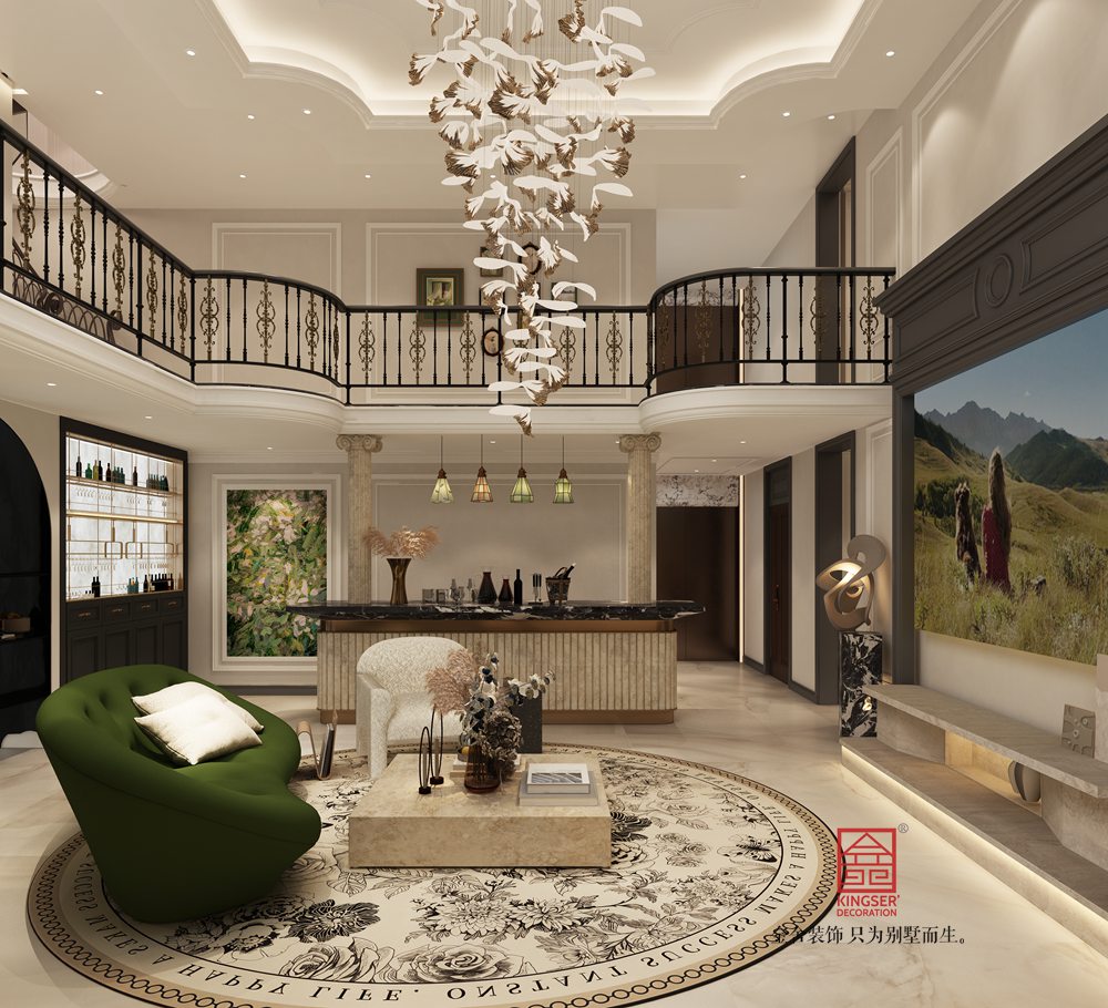 本案挑空客廳以新古典風格為基底,融合現代設計語言。運用經典的石膏線、護墻板勾勒空間秩序,搭配簡約造型的家具與藝術吊燈,既保留古典的優雅韻味,又注入當代的時尚與靈動,實現傳統與現代的對話。