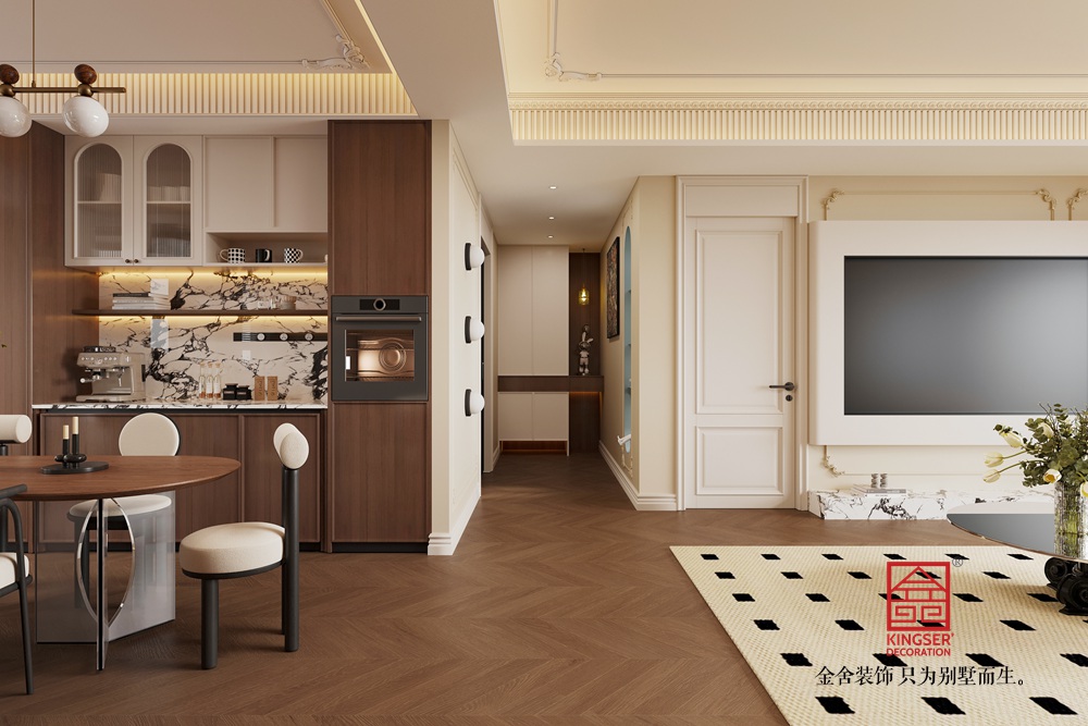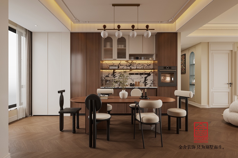 頂部獨特的串珠吊燈,造型別致,燈光透過珠串散發(fā)柔和光暈,為空間蒙上一層復(fù)古浪漫的濾鏡。背景墻的柜體設(shè)計,兼具收納與展示功能,陳列的物品為空間增添了故事感與文化底蘊,整體打造出一個復(fù)古雅致且舒適宜人的中古風(fēng)客廳空間。